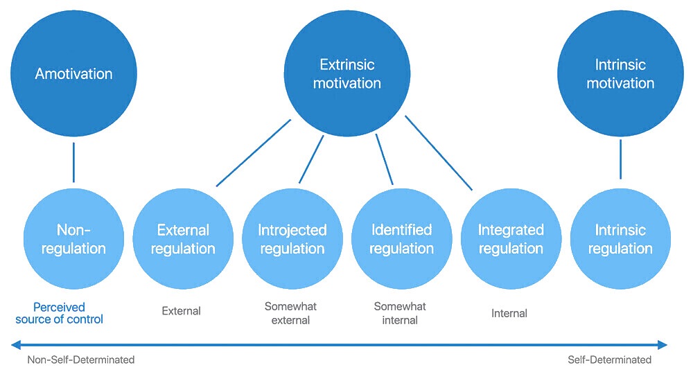 - Geintegreerde regulatie: het gedrag past binnen iemands waarden, overtuigingen en identiteit en is derhalve geïnternaliseerd (Ryan & Deci, 2017).