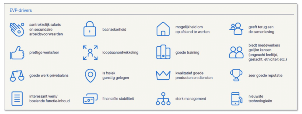 Een sterke EVP bestaat uit zowel materiële als immateriële aspecten. Het gaat derhalve niet alleen om salaris en secundaire arbeidsvoorwaarden, maar ook om zaken zoals cultuur, ontwikkelingsmogelijkheden en zingeving.