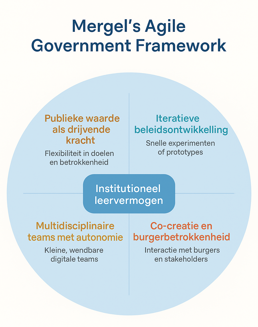 Het uitgangspunt is dat overheidsorganisaties moeten leren omgaan met complexiteit en veranderlijkheid via kortcyclisch leren, samenwerking met belanghebbenden en het actief herdefiniëren van wat publieke waarde betekent. Agile wordt daarbij niet gezien als technische IT-methodologie, maar als bestuursfilosofie (Mergel, 2019).