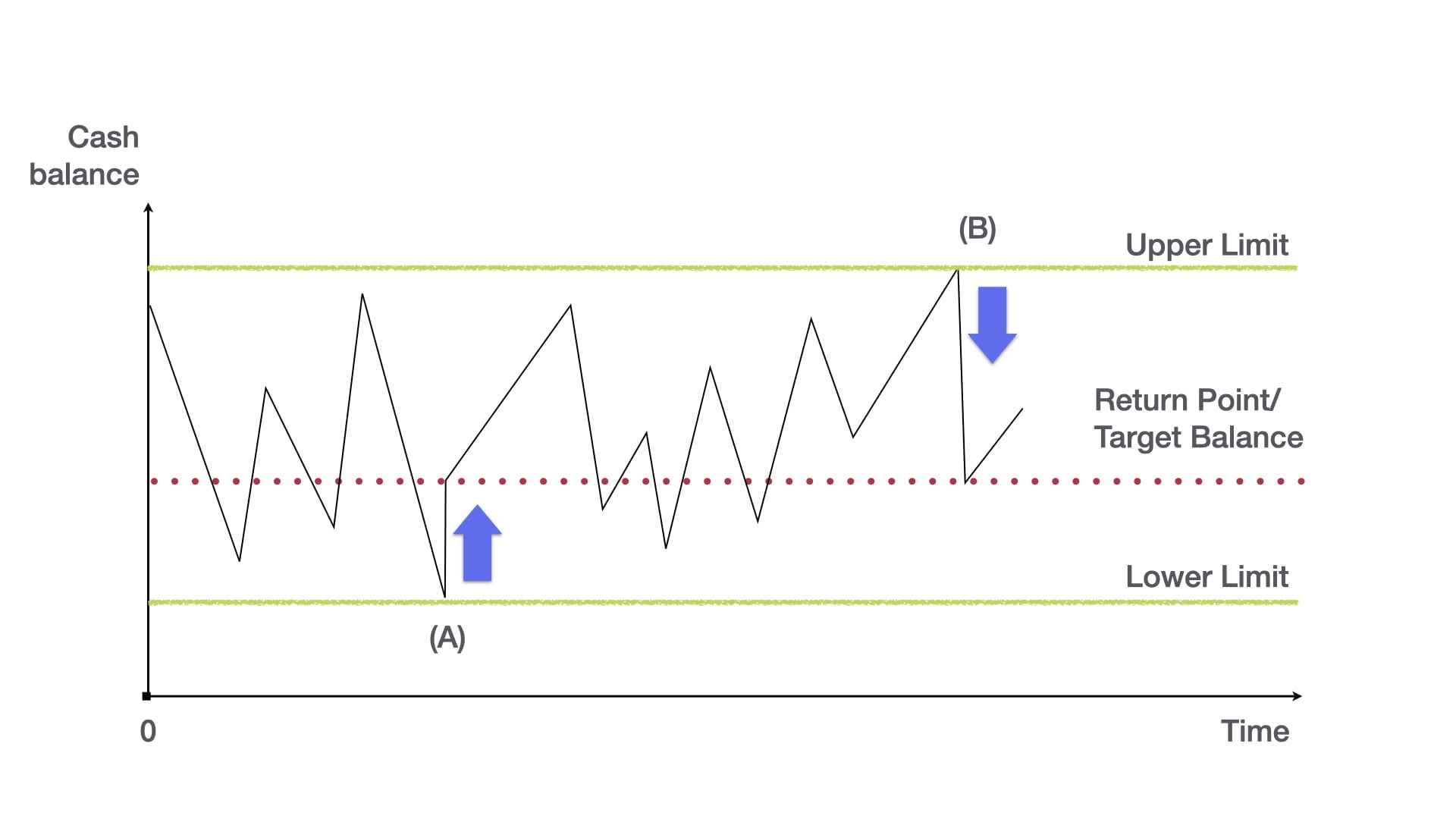 - Bovengrens (U): Wanneer het kassaldo deze limiet bereikt, investeert het bedrijf het overtollige geld in kortlopende effecten of andere beleggingen om rendement te genereren.